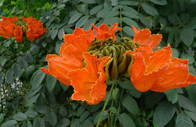 3.火焰木在冬春季節(jié)開花,也是紅花,因此被稱為冬季的火?;鹧婺驹谥袊戏綗釒Ш湍蟻啛釒У貐^(qū)具有巨大的發(fā)展?jié)摿Α?/p>