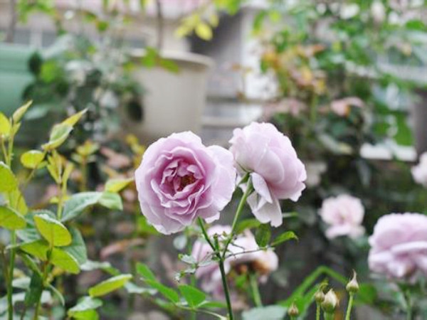 月季花喜光,在生長季節(jié)要有充足的陽光,每天至少要有6小時以上的光照,否則,只長葉子不開花,即便是結(jié)了花蕾,開花后花色不艷也不香。薰衣草花環(huán)和薰衣草花束是月季中的同一個品種,枝條較細(xì),幾乎無刺,多頭開放,花朵顏色為藍(lán)紫色,花徑在6-8厘米,花重瓣,沒有香味,薰衣草花環(huán)長勢迅速,樹勢較強,分枝性不如其他品種。喜好全日照,微酸性土壤,花期自春末至秋末,為藤本或大灌木型品種。